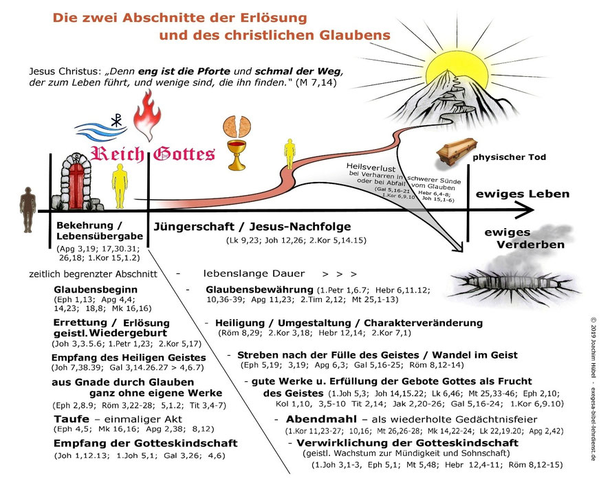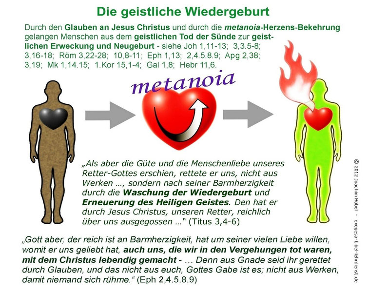 Denn aus Gnade seid ihr errettet durch den Glauben, und das nicht aus euch, Gottes Gabe ist es; nicht aus Werken, damit niemand sich rühme. Denn wir sind seine Schöpfung, erschaffen in Christus Jesus zu guten Werken, die Gott zuvor bereitet hat, damit wir in ihnen wandeln sollen." (Eph. 2,1-10)