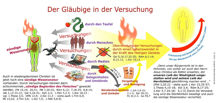 *** Es gibt zwei ungesunde Extreme: den Teufel und die dämonischen Mächte entweder völlig zu ignorieren, oder aber den Finsternismächten eine zu große Beachtung zu schenken. Der Teufel kommt zwar als „Versucher“ (Mt 4,3; 1.Thess 3,5) und möchte Gläubige dazu verführen, den sündigen Begierden des Fleisches zu folgen (1.Petr 2,11) oder die natürlichen Bedürfnisse (Triebe) auf fleischlich-sündige Weise zu befriedigen (1.Kor 7,3.5), doch die fleischlichen Begierden selbst kommen nicht vom Teufel, sondern von der sündigen Wesensnatur, die seit dem Sündenfall im Menschen wohnt. Aber auch nach der Bekehrung schlummert die verdorbene Wesensnatur – „die Sünde“ (Röm 6,12 – Einzahl) – noch in uns! Die Apostellehre macht das deutlich: „Denn ich weiß, dass in mir, das ist in meinem Fleisch, nichts Gutes wohnt …“ (Röm 7,18). „… treibt nicht Vorsorge für das Fleisch, dass Begier-den wach werden!“ (Röm 13,14) „Geliebte, ich ermahne euch …, dass ihr euch der fleischlichen Begierden, die gegen die Seele streiten, enthaltet.“ (1.Petr 2,11) „So herrsche nun nicht die Sünde in eurem sterblichen Leib, dass er seinen Begierden gehorche …“ (Röm 6,12).